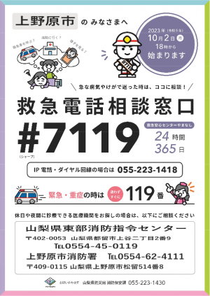 救急電話相談窓口(#7119)をもっと知ってもらうためにポスターを作成しました。ご自由にご活用ください。